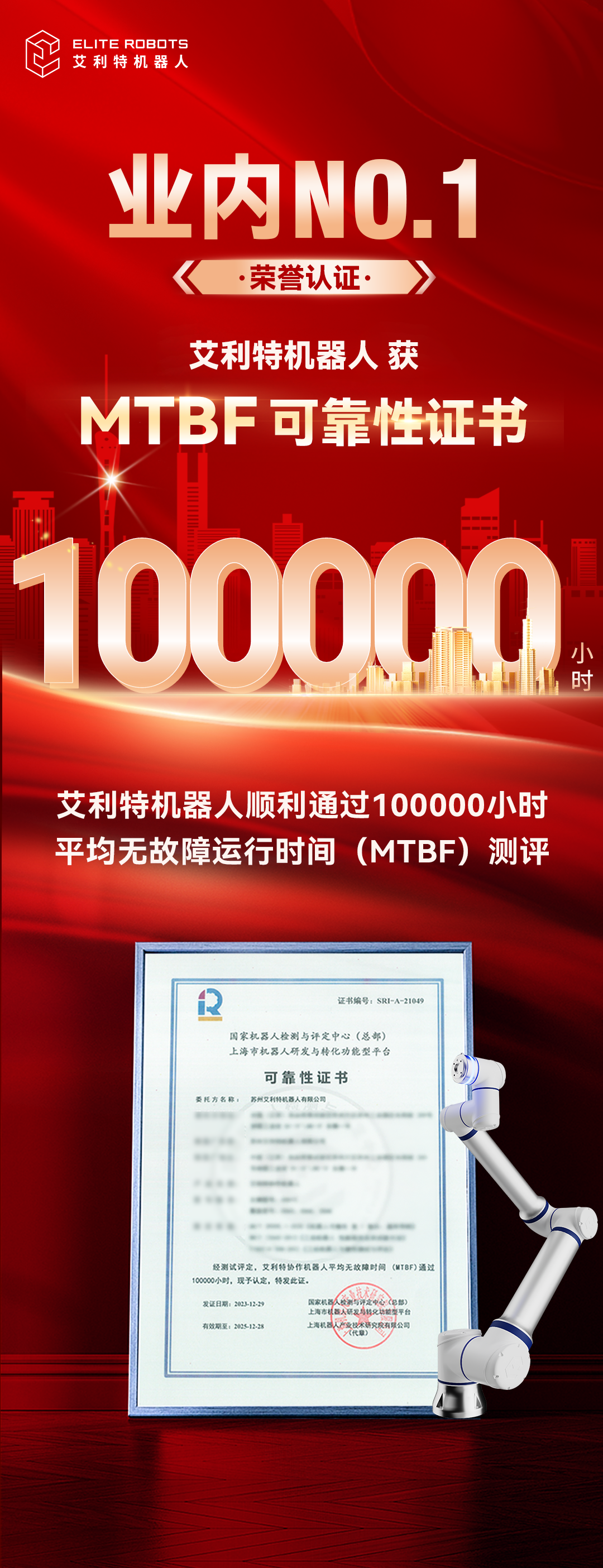 業(yè)內(nèi)首家!艾利特機(jī)器人通過(guò)MTBF 10萬(wàn)小時(shí)認(rèn)證,協(xié)作機(jī)器人可靠性攀頂新臺(tái)階!