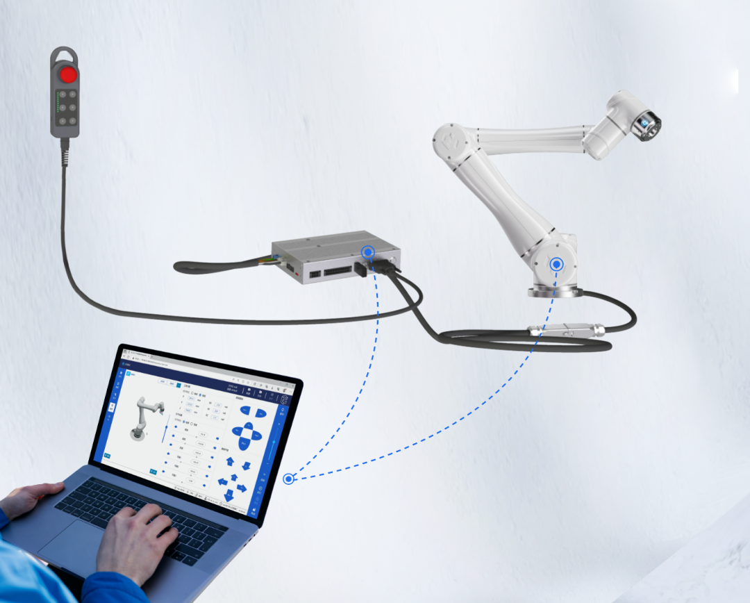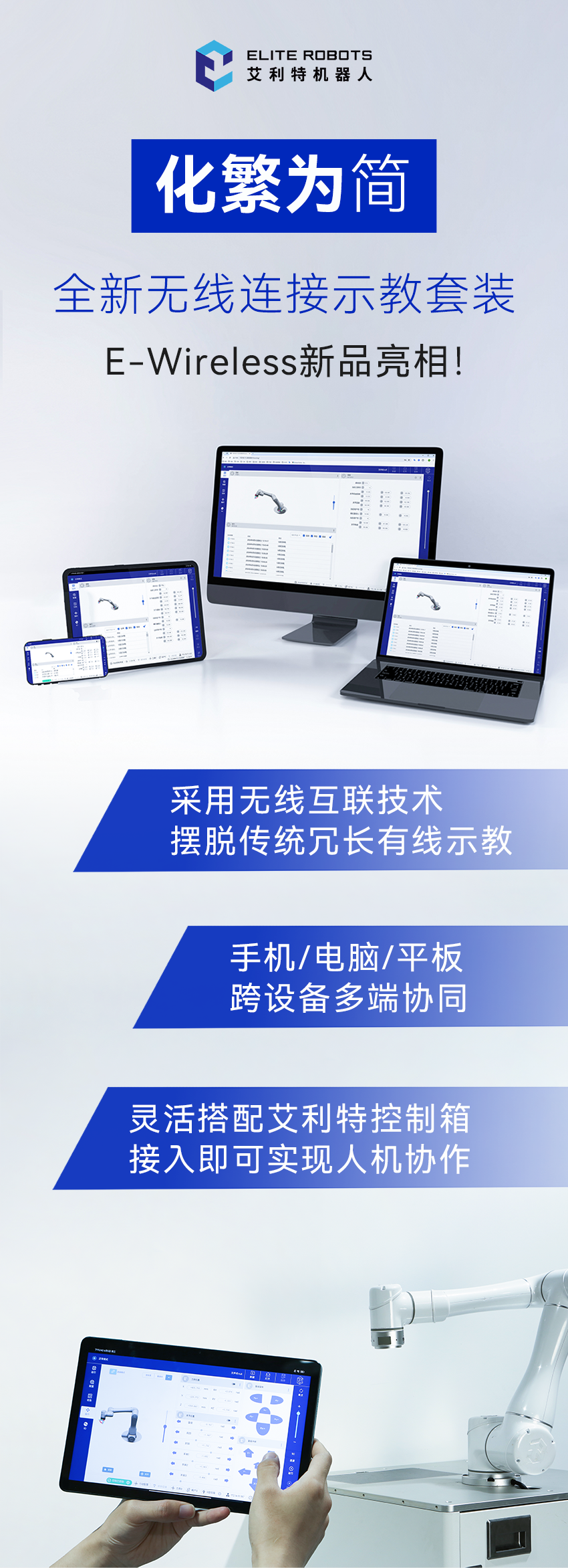 面對醫療、新零售、食品等行業對示教方式和示教器存放空間較為苛刻的應用場景,艾利特針對示教模式重新優化,推出了基于瀏覽器的WebUI示教軟件。針對現代工業復雜多變以及日益增長的特殊場景需求,搭配艾利特標準控制箱或超薄MINI控制箱,構成的精妙組合——全新E-Wireless無線示教套裝正式亮相!