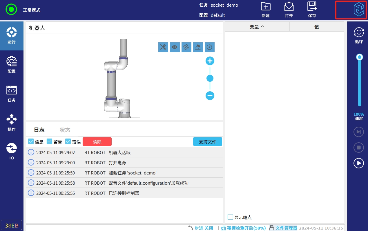 外部設備可以往30001直接發送機器人腳本,機器人處于遠程模式,機器人就會運動。