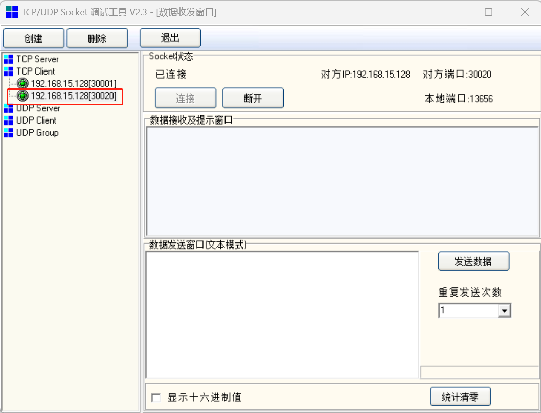 4. 用通訊助手創(chuàng)建一個(gè)30020端口的客戶端