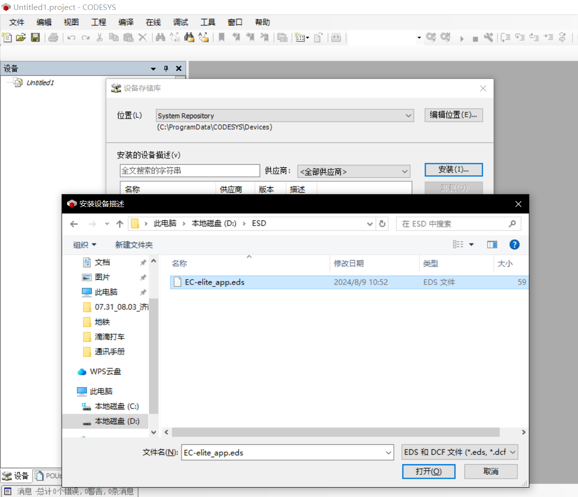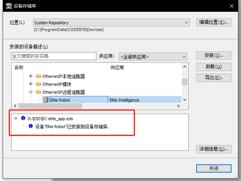 加載安裝 elite 的EDS 文件,在 Codesys 菜單欄-工具-設(shè)備存儲(chǔ)庫(kù),點(diǎn)擊安裝,導(dǎo)入附件中對(duì)應(yīng) EC 機(jī)器人 eds 文件。導(dǎo)入后文件會(huì)出現(xiàn)在 EthernetIP 總線下,同時(shí)顯示文件已經(jīng)安裝到設(shè)備存儲(chǔ)庫(kù)