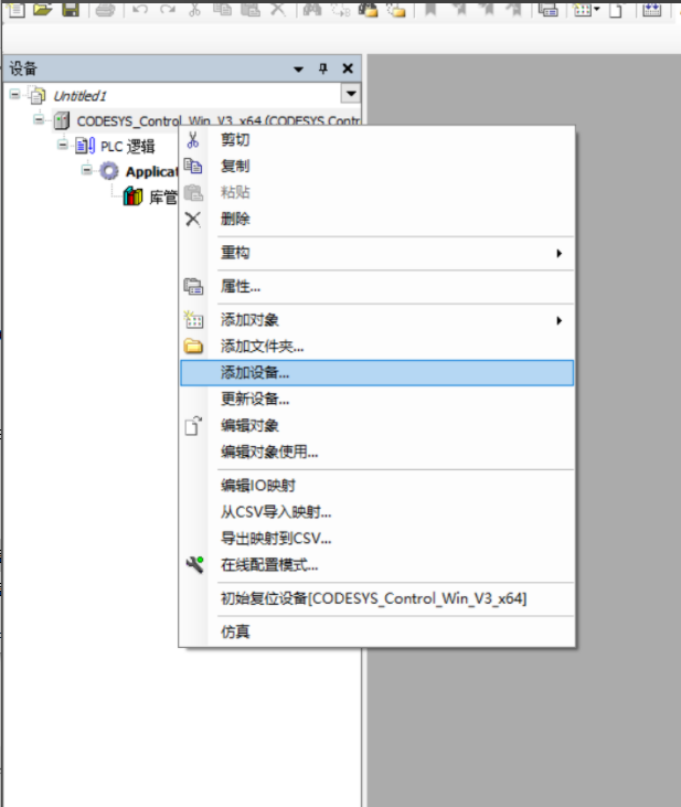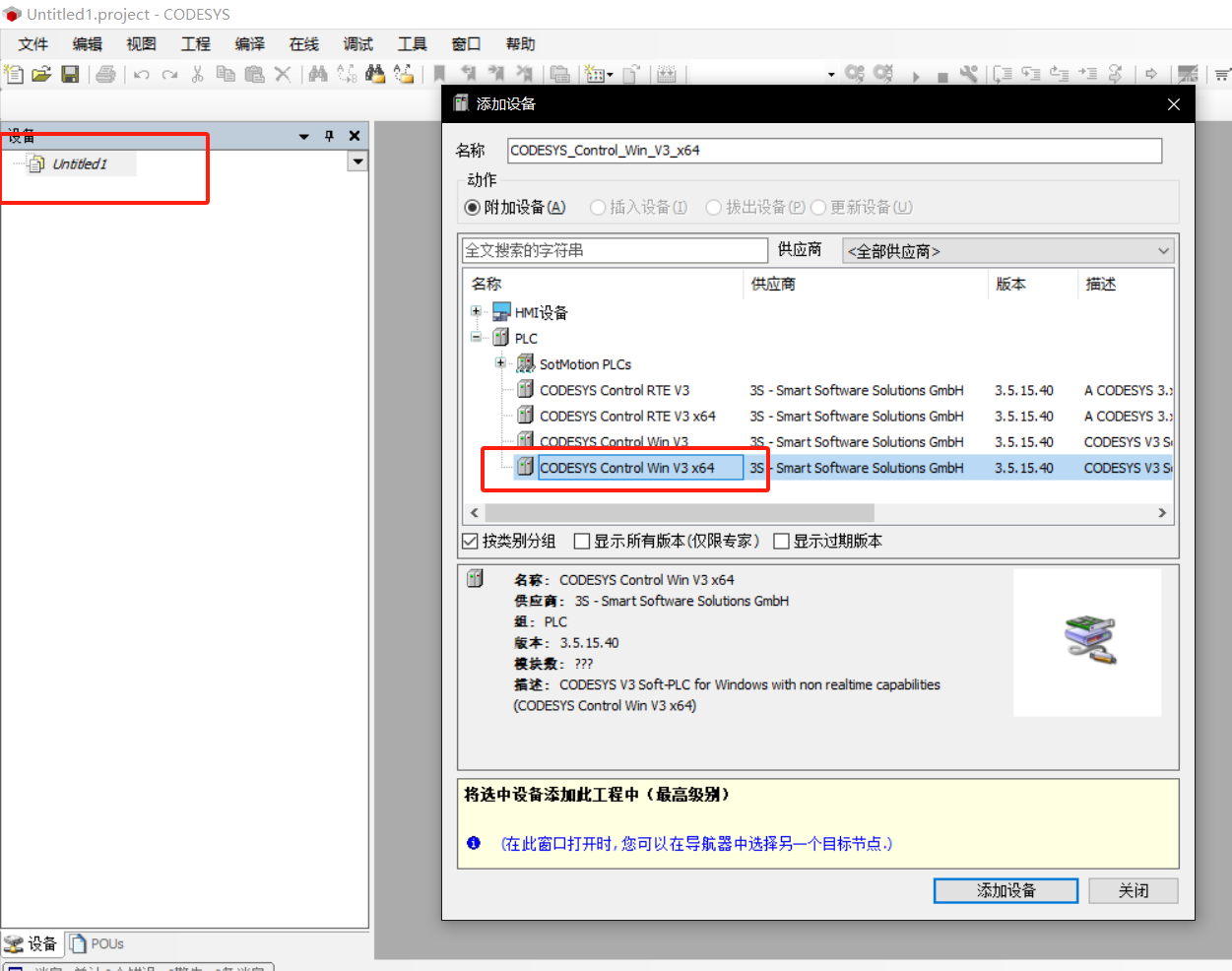 選擇新建設(shè)備 Untitled1,右鍵點(diǎn)擊添加設(shè)備,選擇對(duì)應(yīng)的 CODESYS Control Win V3 X64 中的 PLC,點(diǎn)擊添加設(shè)備