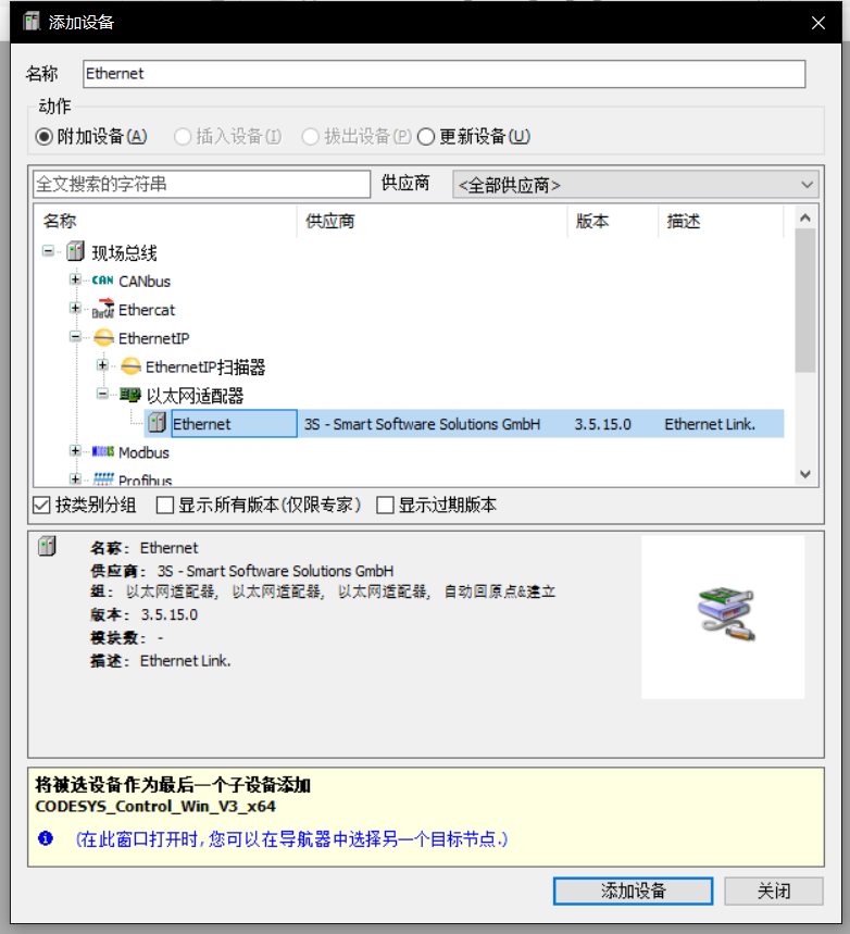 選擇現(xiàn)場(chǎng)總線--EthernetIP--以太網(wǎng)適配器--Ethernet,點(diǎn)擊右下角添加設(shè)備
