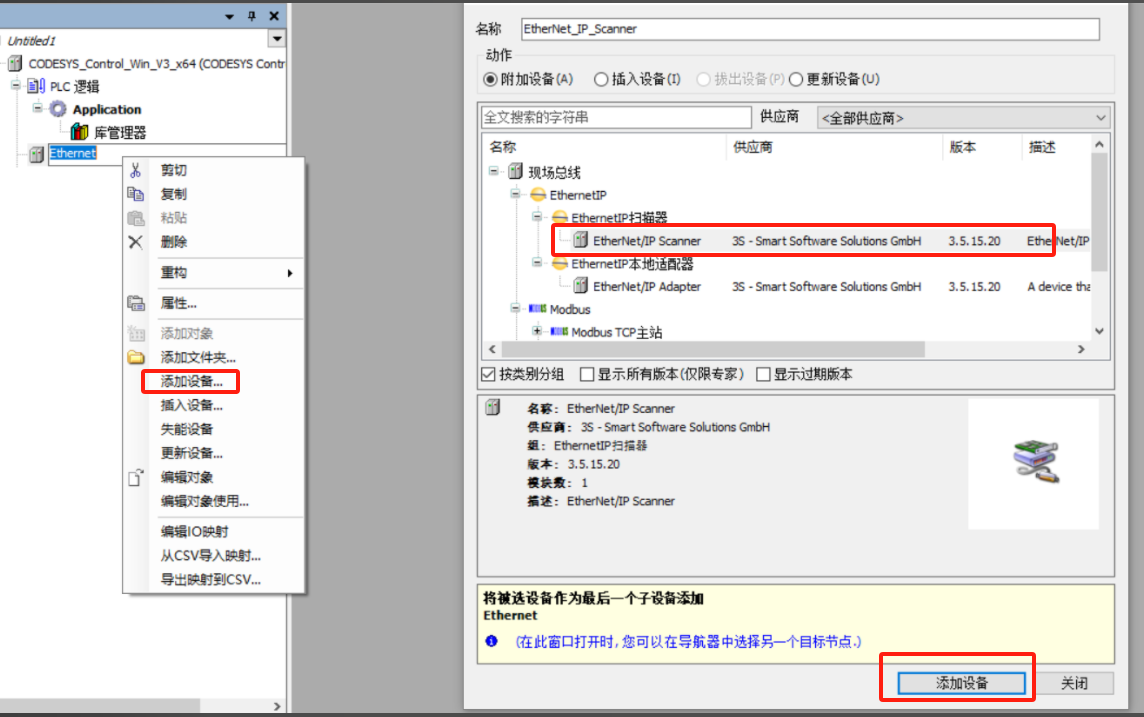 選擇設(shè)備欄 Ethernet(Ethernet),點(diǎn)擊右鍵選擇添加設(shè)備,選擇 Ethernet/IP Scanner,點(diǎn)擊右下角添加設(shè)備