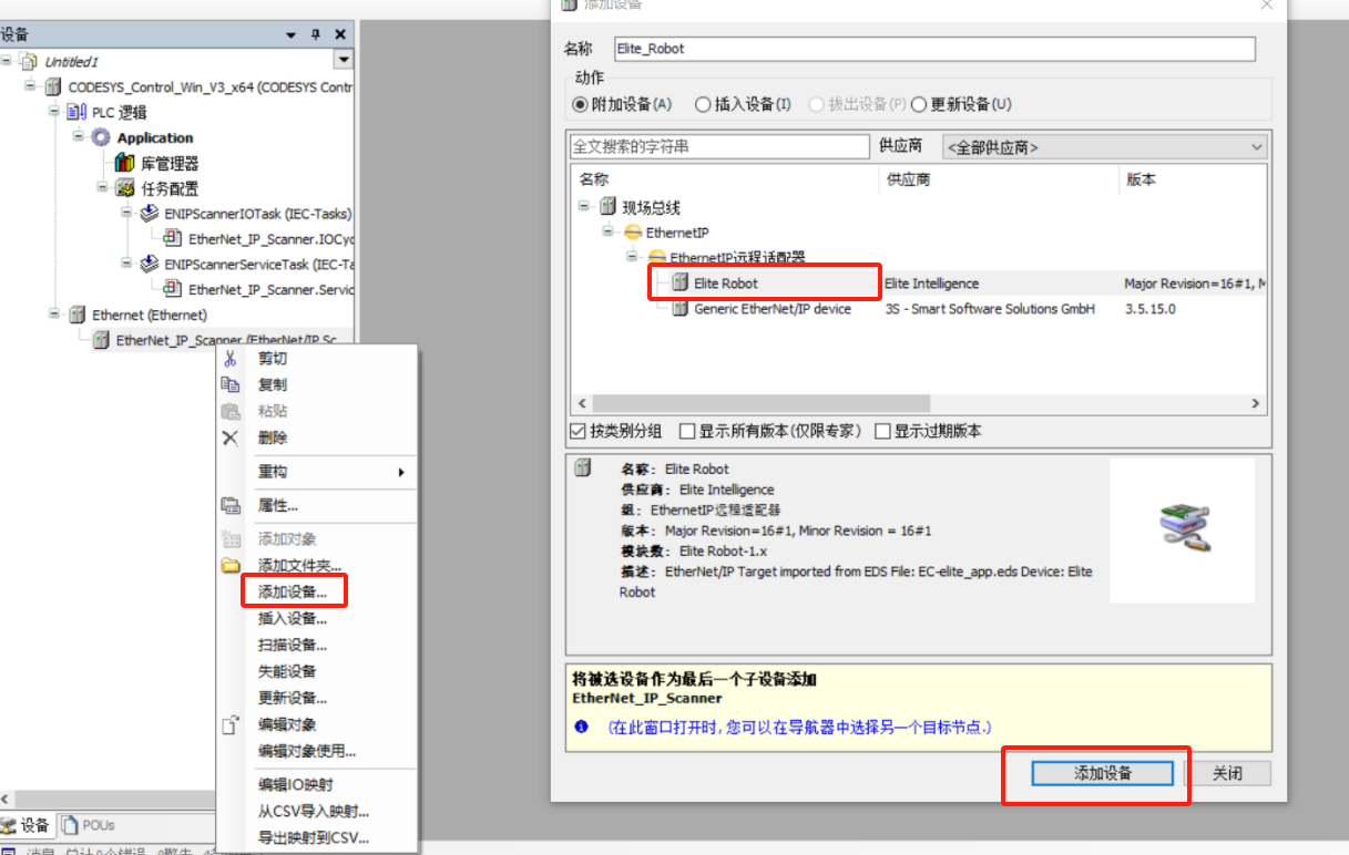 選擇 Ethernet/IP Scanner,點(diǎn)擊右鍵選擇添加設(shè)備,選擇 Elite Robot,點(diǎn)擊右下角添加設(shè)備