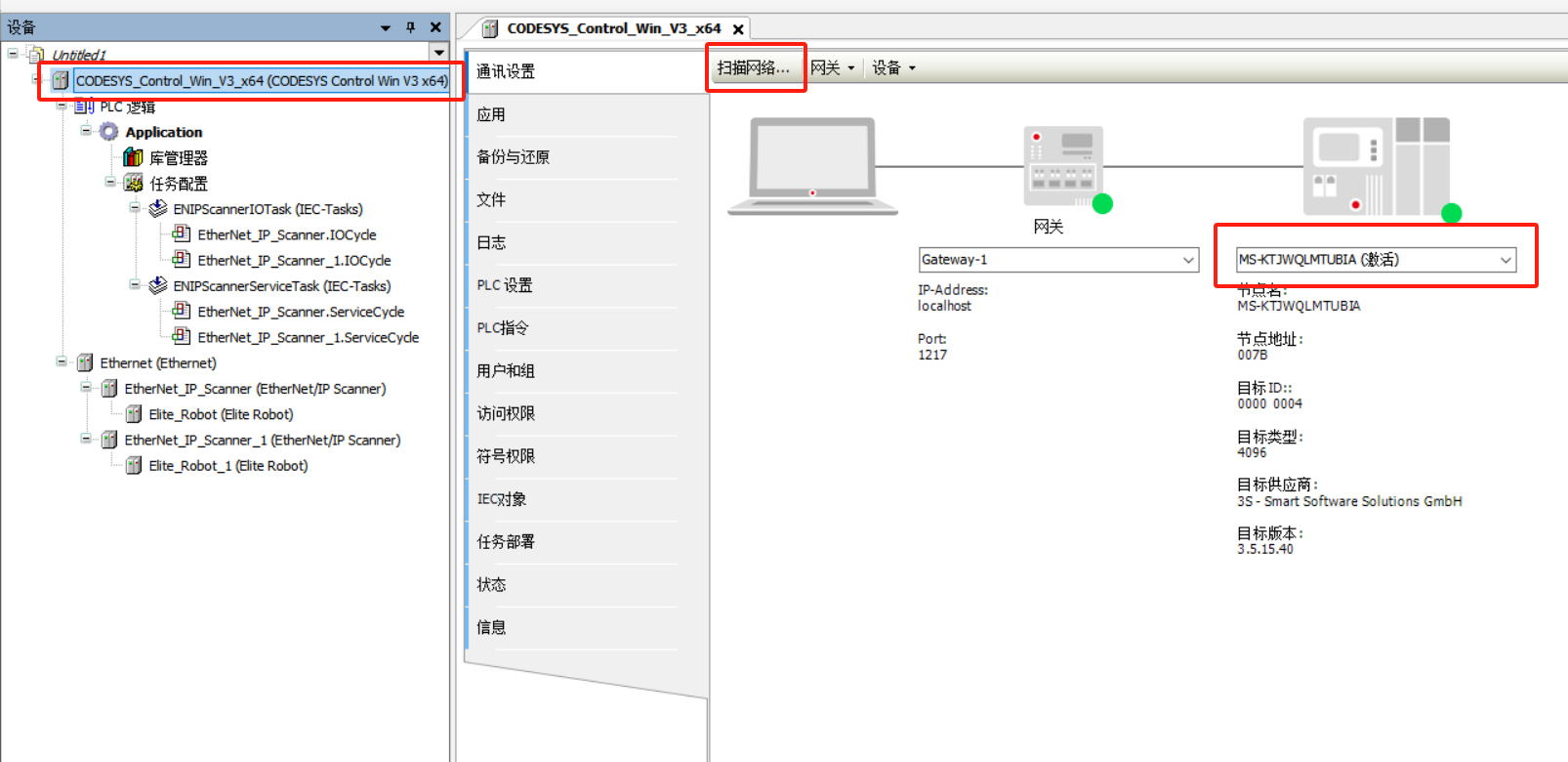 雙擊 CODESYS Control Win V3 X86 設(shè)備,進(jìn)入通訊設(shè)置,選擇對(duì)應(yīng)電腦名稱,掃描設(shè)備