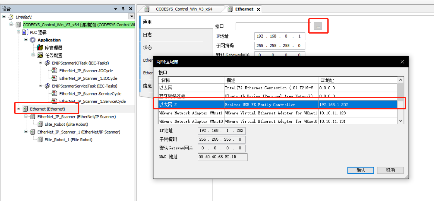 設(shè)置 Ethernet 主站 IP 地址,雙擊 Ethernet,選擇通用中的“...”,選擇對(duì)應(yīng)的以太網(wǎng),如下圖所示
