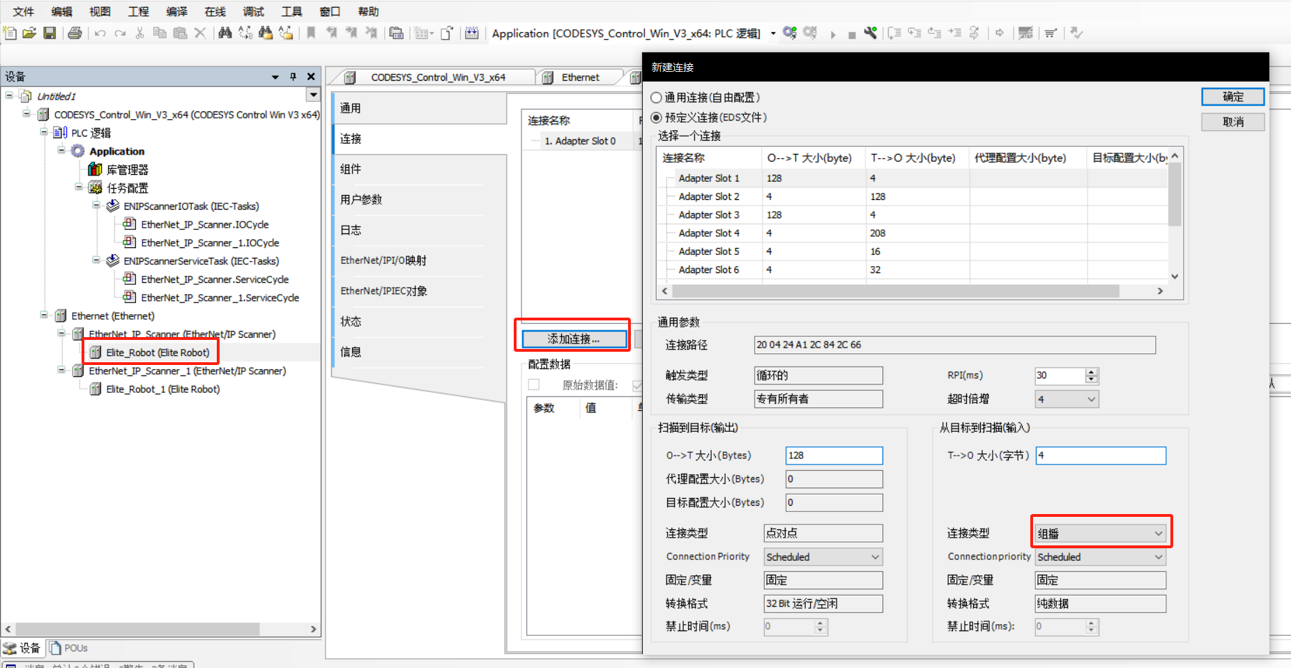 選擇 Elite Robot 模塊進(jìn)行配置,選擇連接,根據(jù)需要添加連接,這里連接 Adapter Slot 0、1、2、3、4、9、10,包含 INT 輸入輸出寄存器、Float 輸入輸出寄存器、位置信息寄存器及 M 虛擬輸入輸出(通訊類型選擇組播)