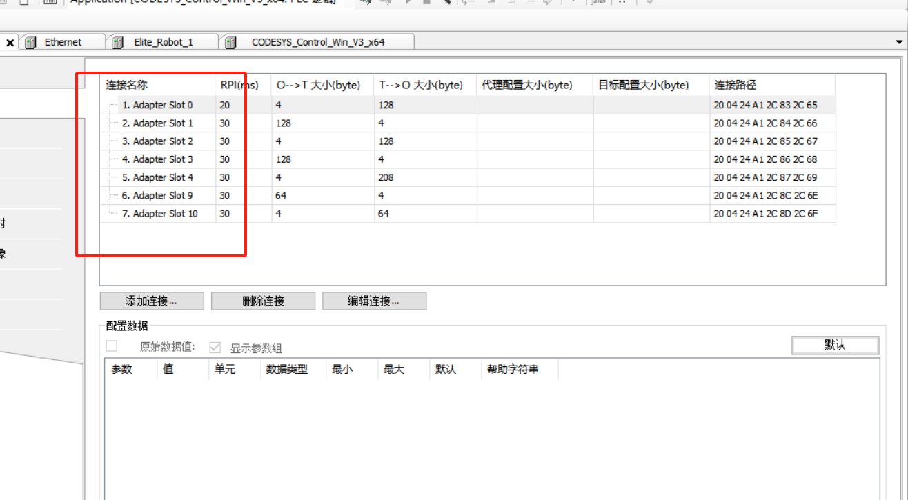 Adapter Slot 1: 32 個(gè) 32 位 int 輸入寄存器,地 址范圍 [0,31] 傳輸方向 O->T(codesys--elite)