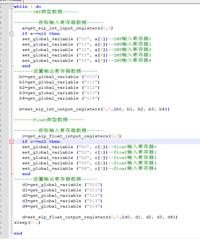 機(jī)器人導(dǎo)入腳本并運(yùn)行,關(guān)聯(lián)各 5 個(gè) INT 輸入輸出和 Float 輸入輸出,腳本如下所示(具體釋義可參考 LUA 腳本手冊(cè))