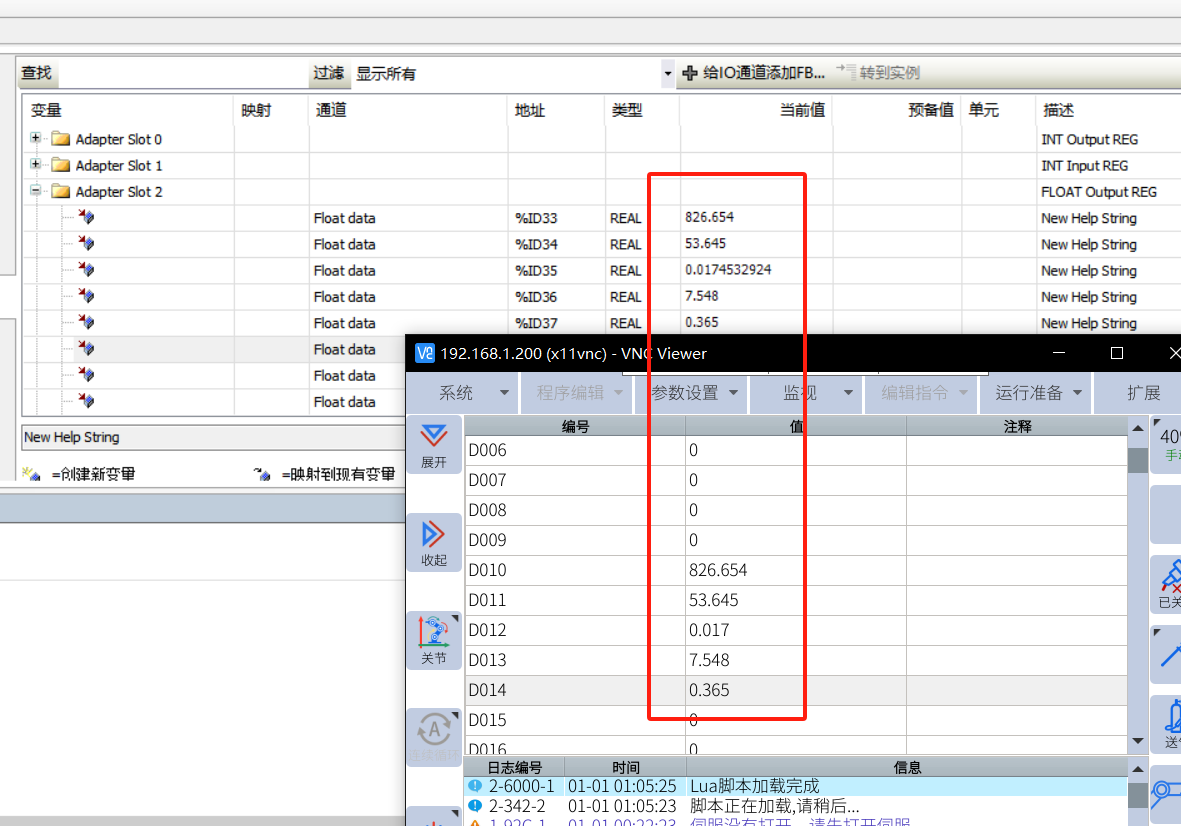Float 輸出,將機(jī)器人數(shù)值發(fā)送到 codesys 變量,D010-D014 關(guān)聯(lián)到 Adapter Slot 2 輸出前 5 個(gè)數(shù)值,數(shù)據(jù)變化一致