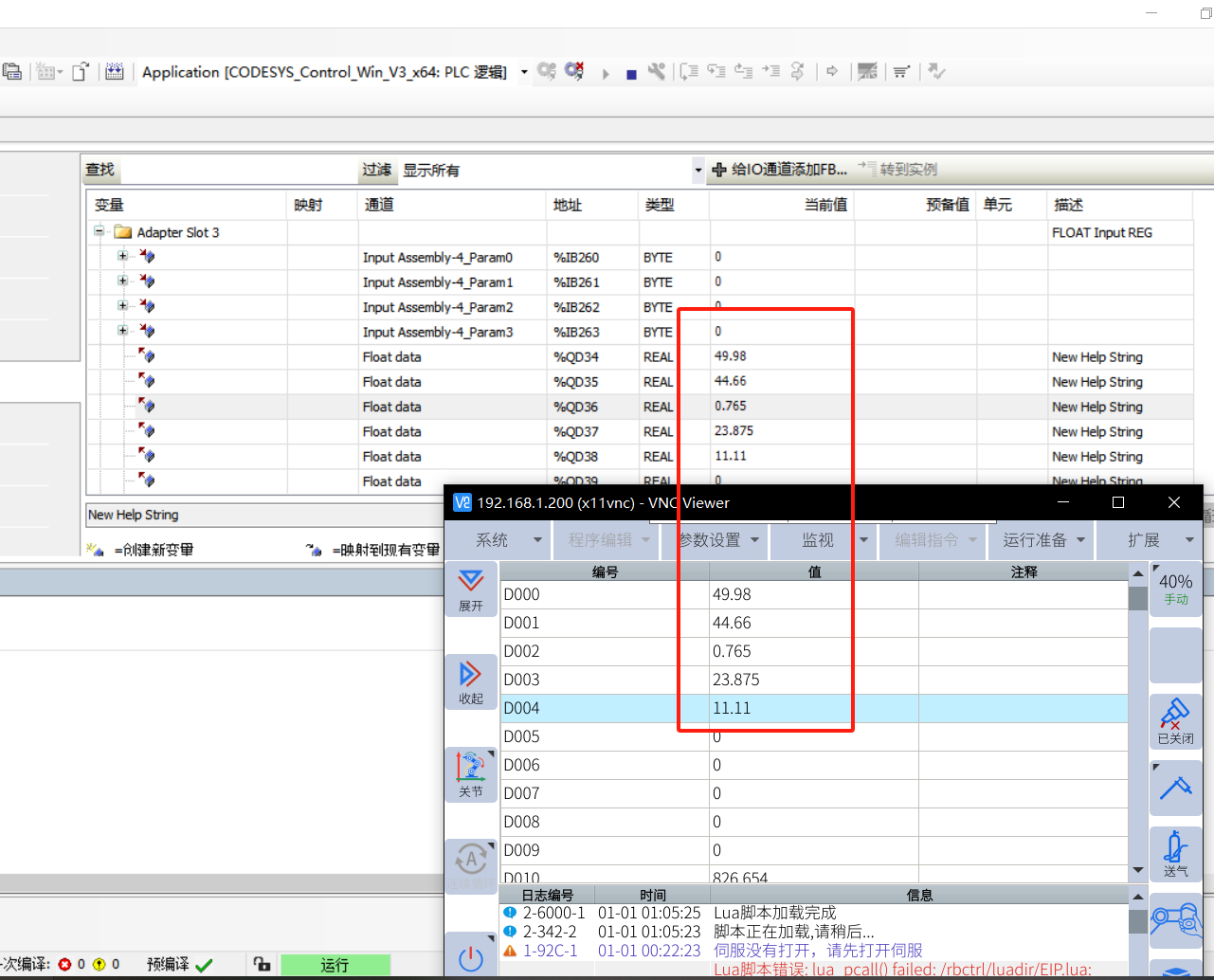 Float 輸入,將 codesys 數(shù)值發(fā)送到機(jī)器人變量,D000-D004 關(guān)聯(lián)到 Adapter Slot 3 輸入前 5 個(gè)數(shù)值,數(shù)據(jù)變化一致