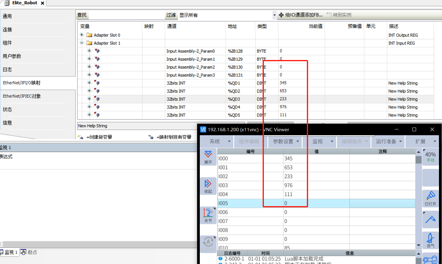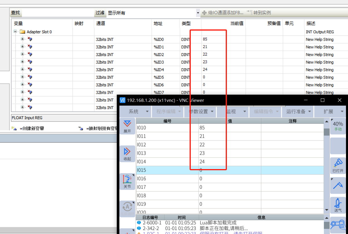 INT 輸出,將機(jī)器人數(shù)值發(fā)送到 codesys 變量,I010-I014 關(guān)聯(lián)到 Adapter Slot 0 輸入前 5 個(gè)數(shù)值,數(shù)據(jù)變化一致