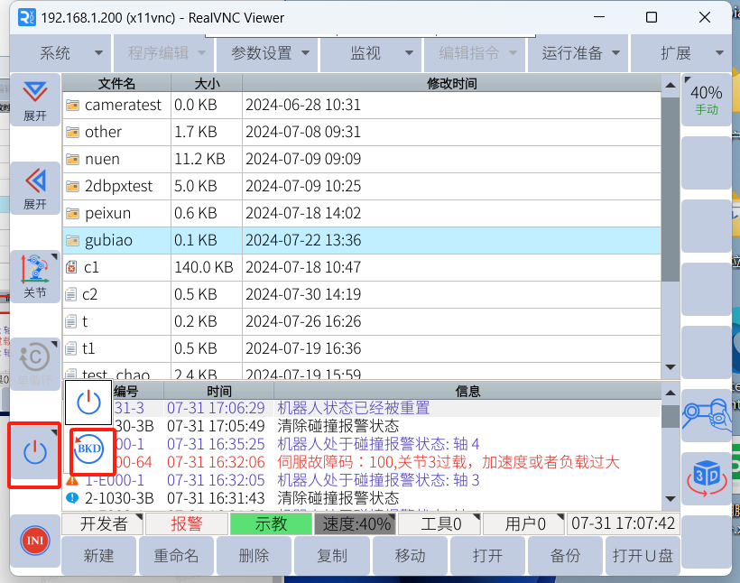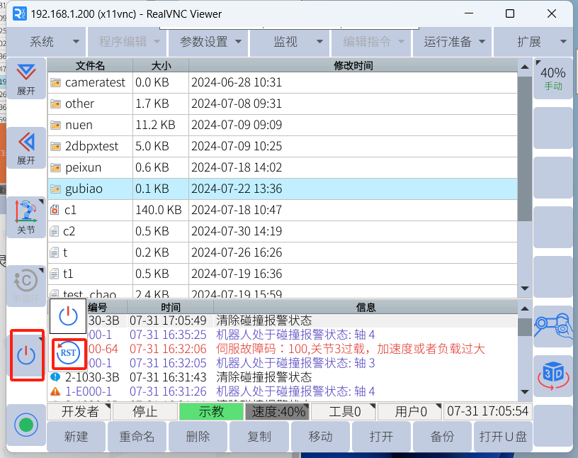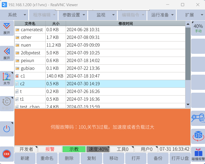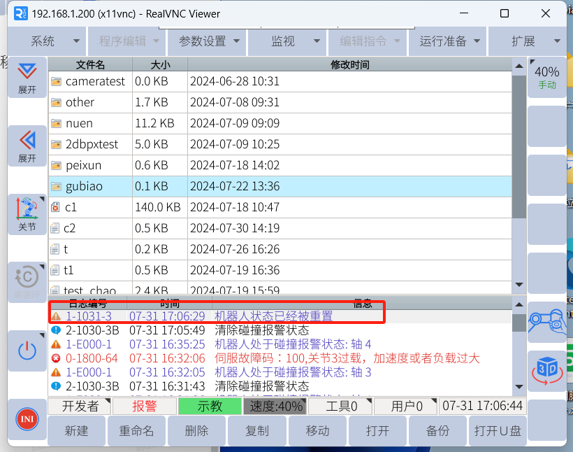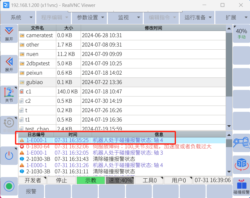 2、伺服故障100為機(jī)器人系統(tǒng)報(bào)警,如果無法清除報(bào)警可先降低或者關(guān)閉碰撞報(bào)警靈敏度后反向移動機(jī)器人脫離卡死。