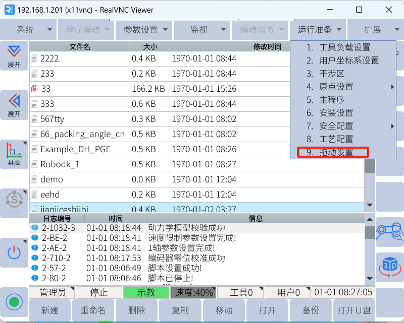 先升級(jí)為管理員權(quán)限模式,管理員權(quán)限密碼為333333,在運(yùn)行準(zhǔn)備中,點(diǎn)擊拖動(dòng)設(shè)置。