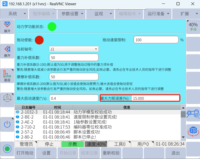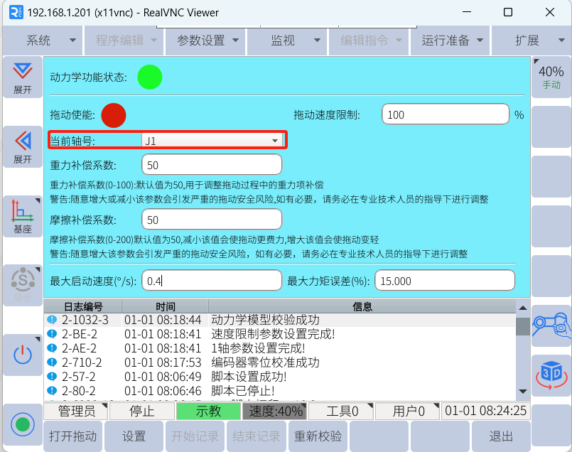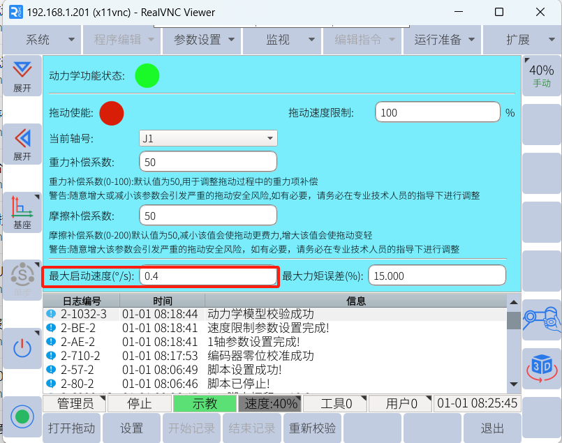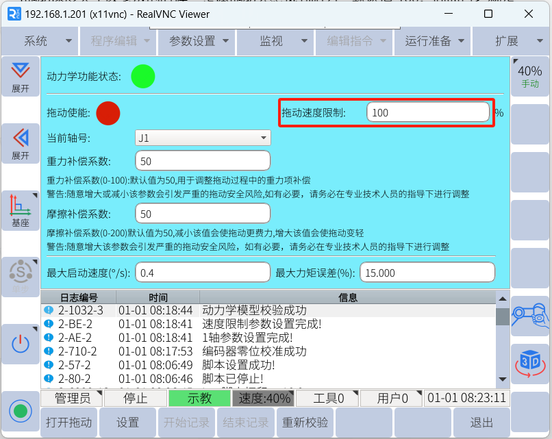 在實(shí)際操作中,我們常常會(huì)用到拖動(dòng),可以達(dá)到快速移動(dòng)機(jī)器人的目的。設(shè)置合適的拖動(dòng)參數(shù)可以使拖動(dòng)變得更加靈活