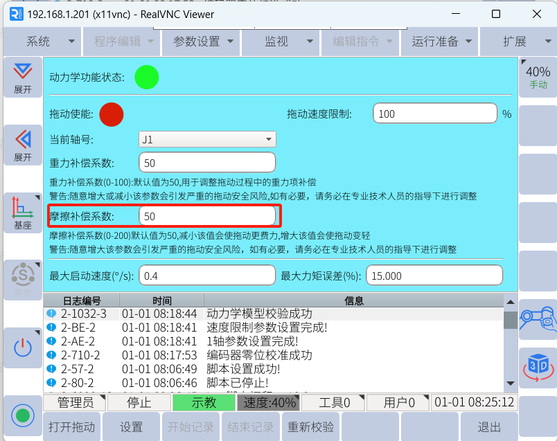 打開拖動(dòng),拖動(dòng)某個(gè)關(guān)節(jié)時(shí)感覺摩擦力較大,拖動(dòng)比較費(fèi)力,可將該軸的摩擦補(bǔ)償系數(shù)調(diào)大,參數(shù)值越大,摩擦力越小,拖動(dòng)越輕松。數(shù)值設(shè)置的越小,摩擦力越大,拖動(dòng)越吃力。默認(rèn)值為 50,建議可設(shè)置 60-90 之間,不建議設(shè)置到 100,默認(rèn)50。