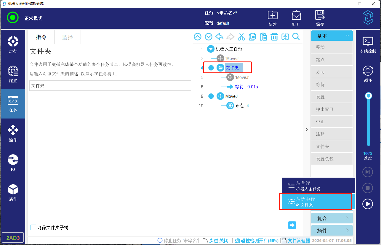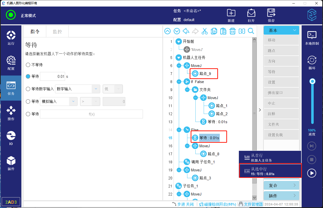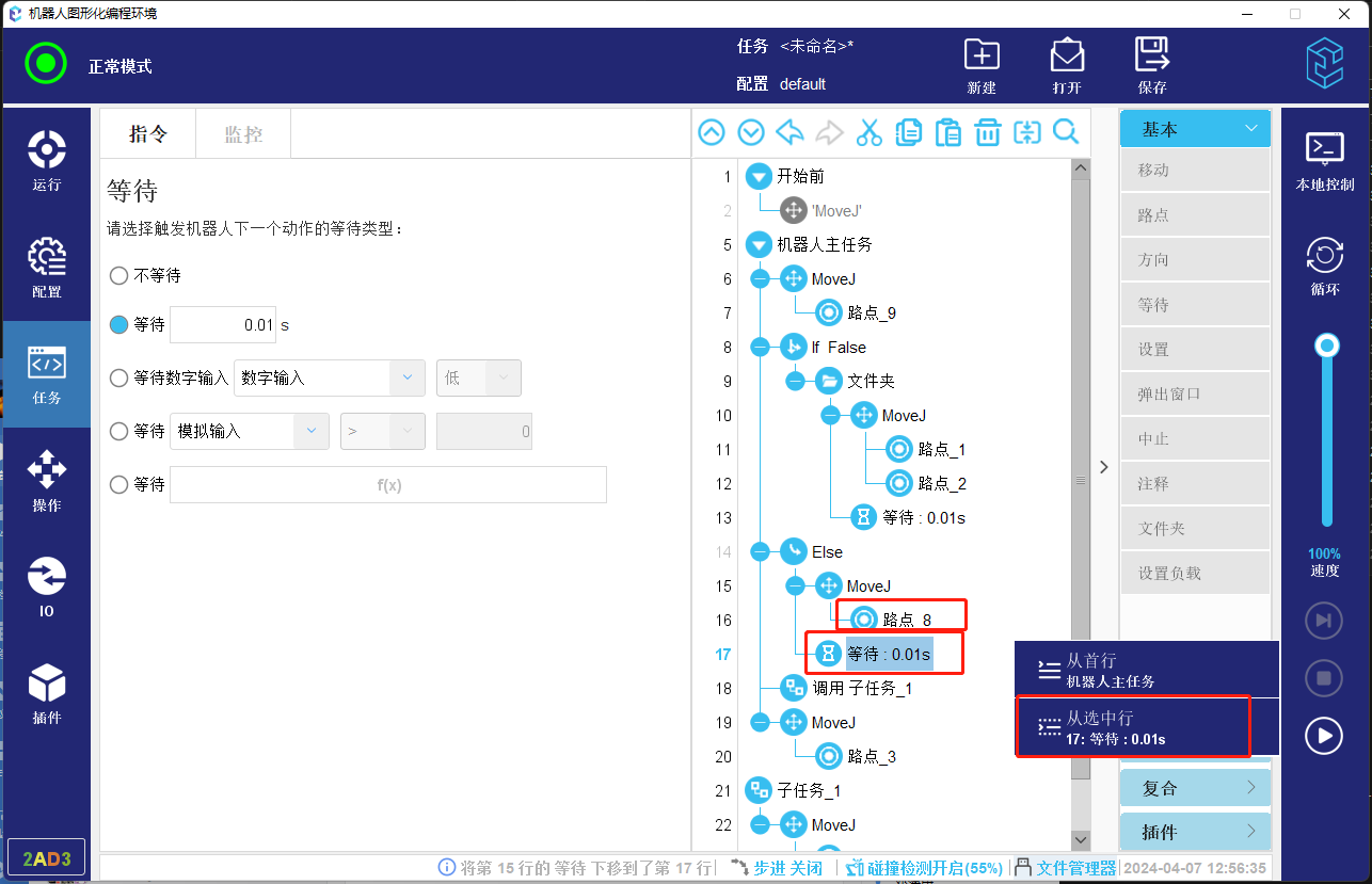 4. 如果當前選中的任務節點上方無可以運行到的節點并且內部也沒有可以運行到的點,則會直接開始運行,不再繼續向后考慮支持運行到的路點。所以下方圖-13所示程序會支持開始運行,不會已路點_4作為起始位置。