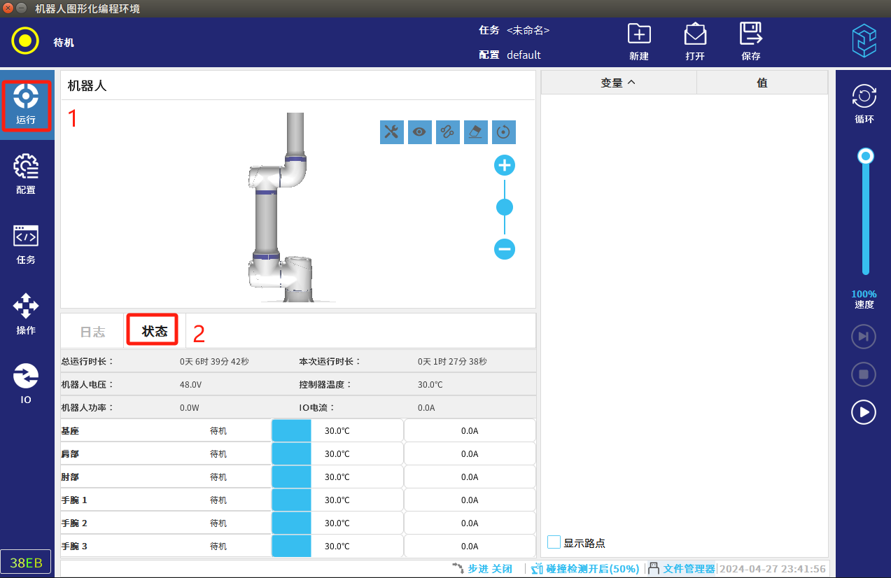 - 機器人顯示”待機“狀態后退出,進入運行頁面,切換狀態