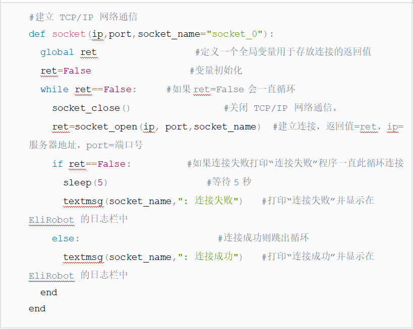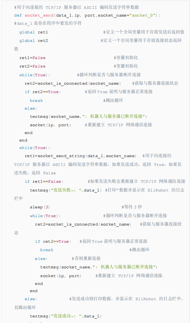 - 以上代碼是以發送字符串和讀取字符串為例,如果想發送/讀取其他數據類型,只需要更換代碼中的socket_send_string/socket_read_string即可,具體指令參考CS機器人腳本手冊下載中心_機器人技術-艾利特機器人