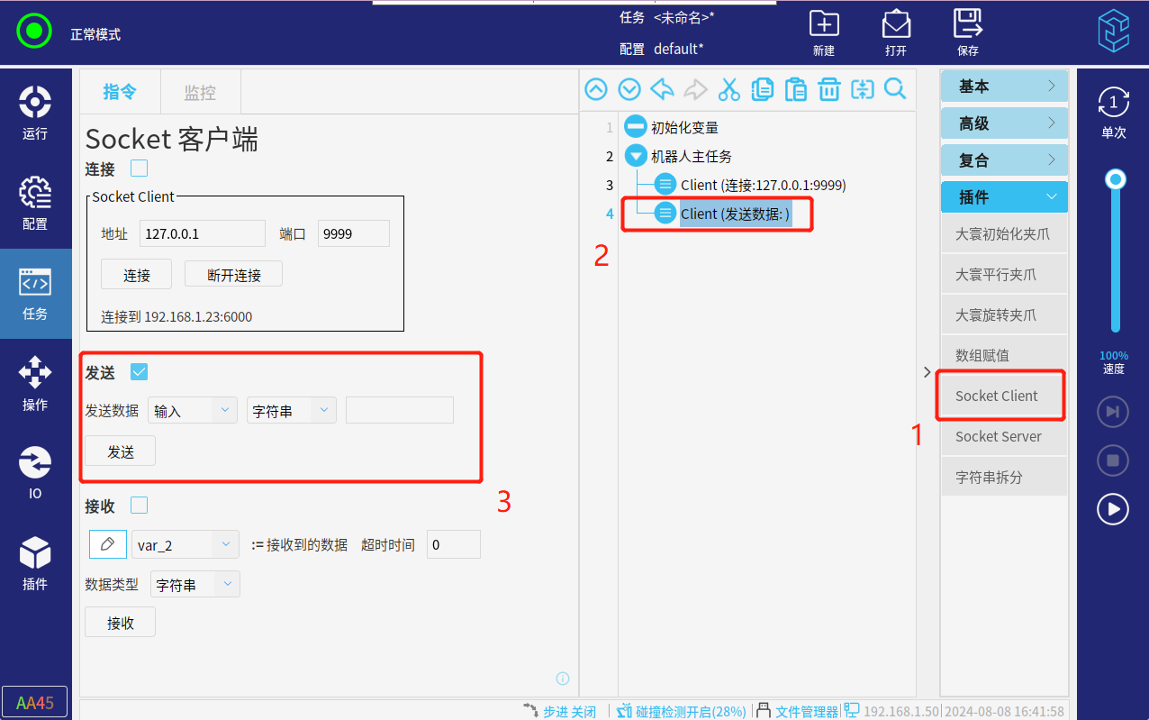 選擇導航欄“任務”-指令欄選擇“插件”-點擊"Socket Client"-設置該指令(勾選“發送”-輸入對應的數據類型)可以手動點擊”發送“,也可以直接”運行任務“來發送