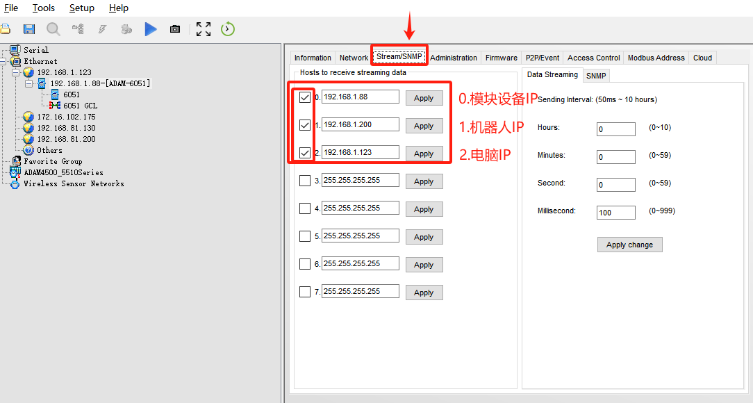 設置完成后點擊下圖,勾選前面方框,設置能夠控制模塊的IP地址,設置完成后點擊Apply。