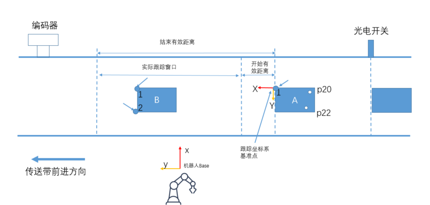 示教完跟蹤軌跡后將傳送帶緩慢開動一段距離后(設定的有效結束距離400mm以內,最優300-350mm),停止傳送帶運動(傳送帶速度保持不變),將機械臂移動至B點并記錄B點(A點B點需戳向同一個特征點記錄),記錄A點和B點時,下面會顯示編碼器數值,