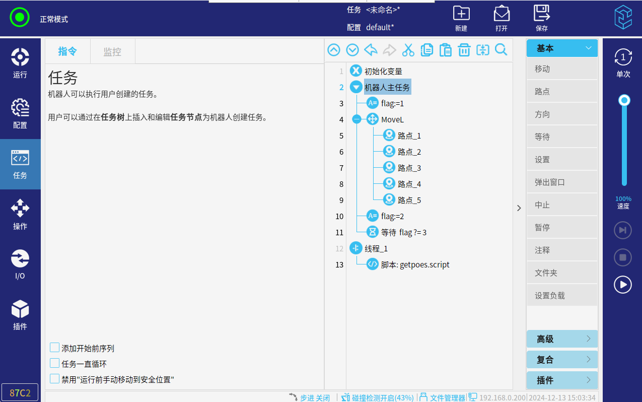 3.以上操作完成后,就可以運行程序了。初次運行,速度百分比調低一點,插件參數設置的不對,運行過程中可能會有抖動。