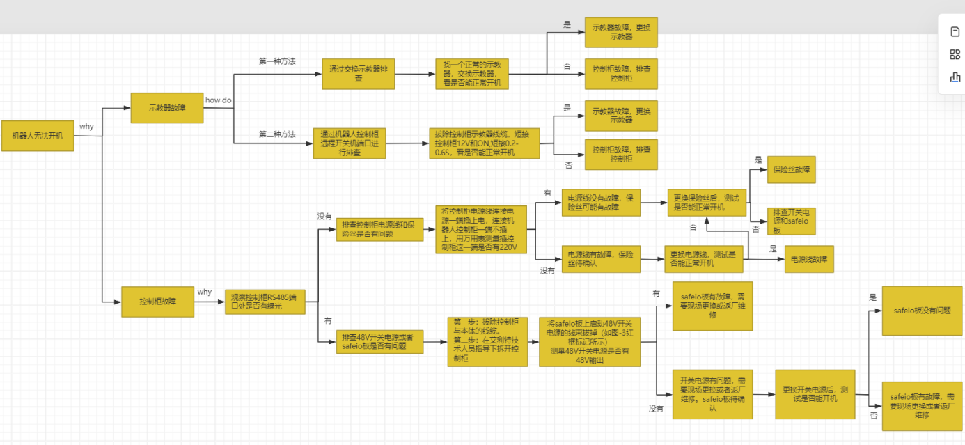 在客戶現(xiàn)場很有可能會出現(xiàn)機器人無法開機的問題,出現(xiàn)這種問題的原因有可能是客戶人為導致的,也有可能是設(shè)備質(zhì)量問題,所以我們要善于去排查是什么問題導致的機器人無法開機。