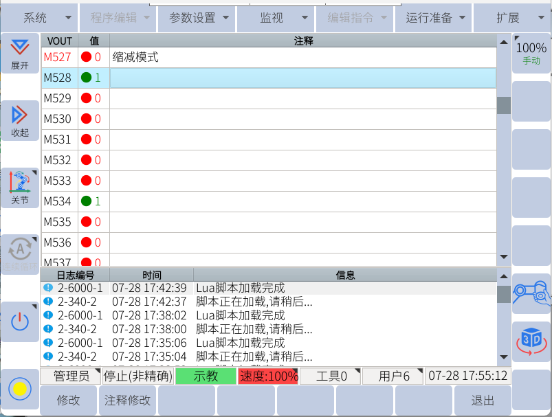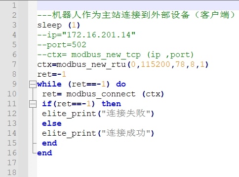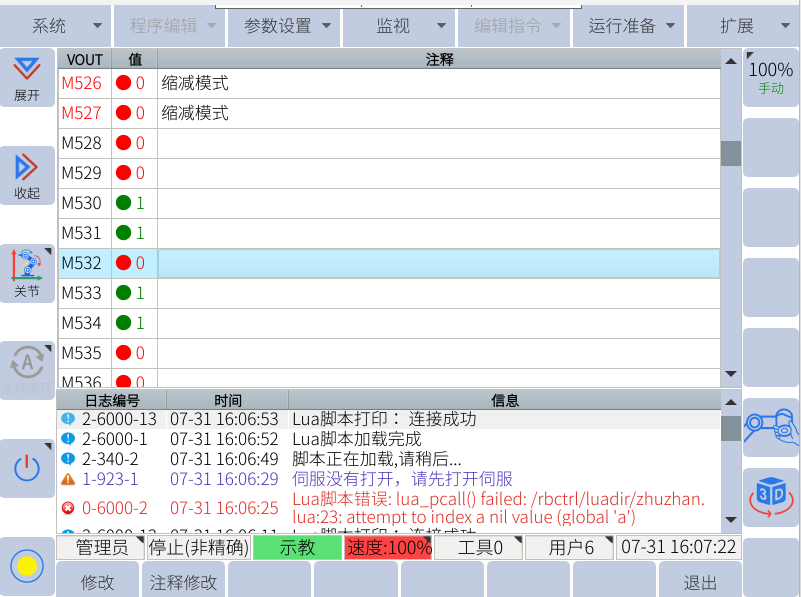 將機器人端485線接好,目前設置波特率為115200,將機器人腳本配置好,如下圖所示