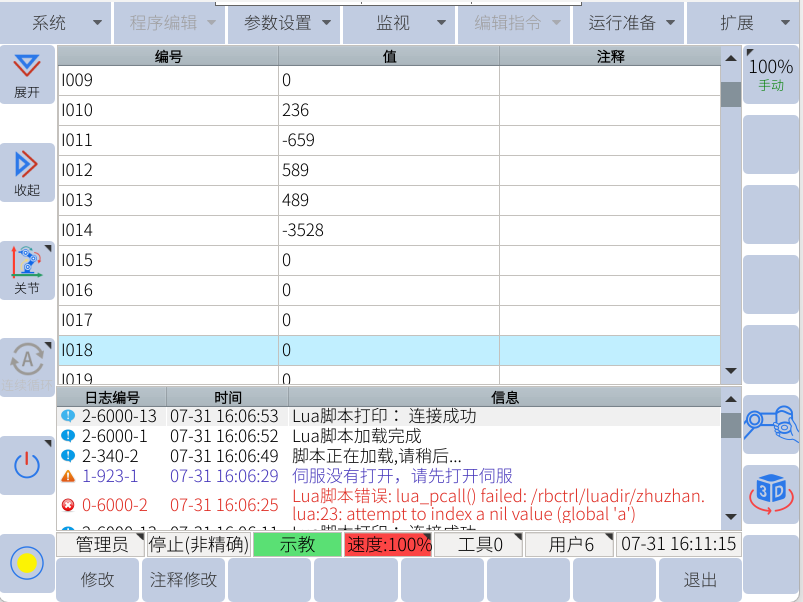 通過助手向寄存器300-304賦值,可通過示教器查看I0-I4數值,確實數值是否正確,如下圖所示