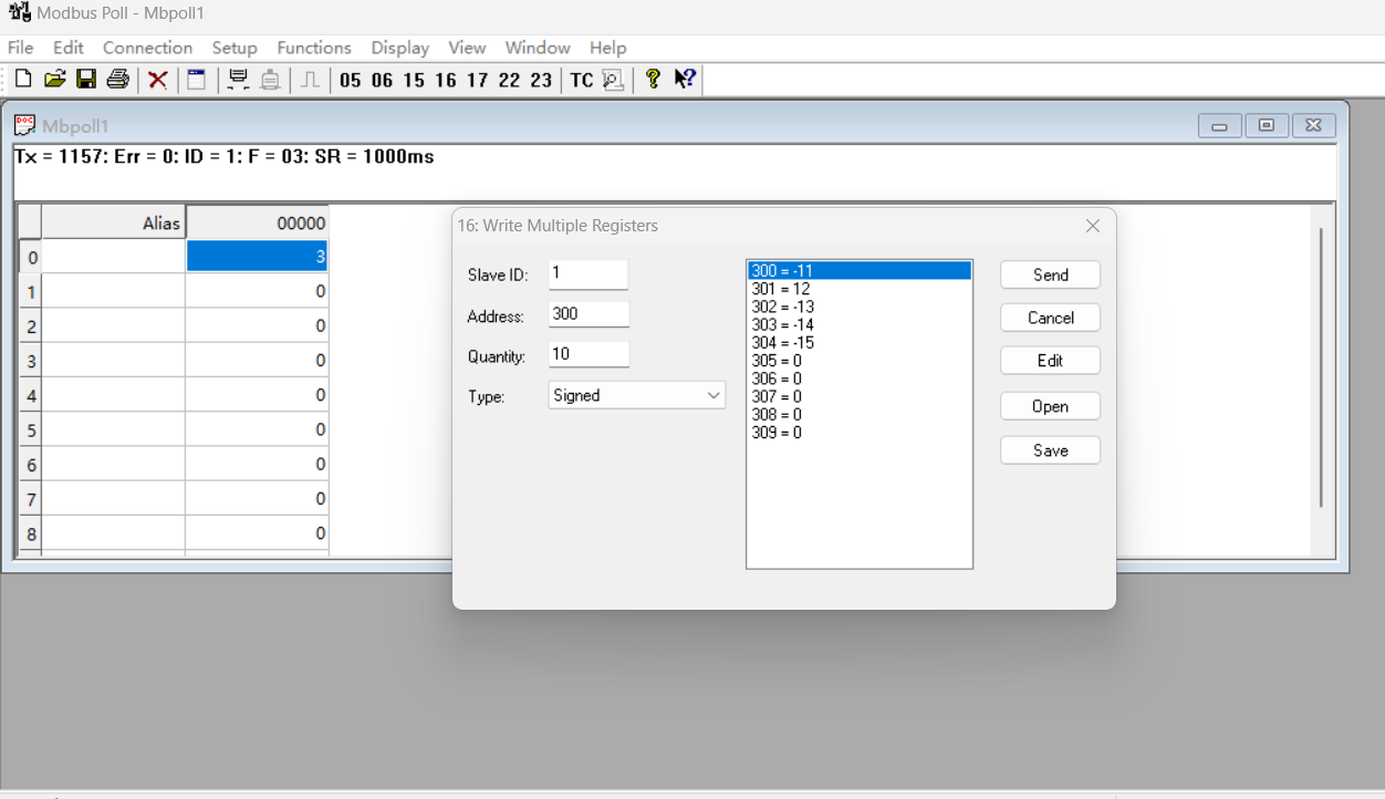 助手端將400寄存器設置為123,401寄存器設置為23,402寄存器設置為-345,403寄存器設置為-876,404寄存器設置為2345