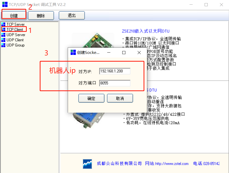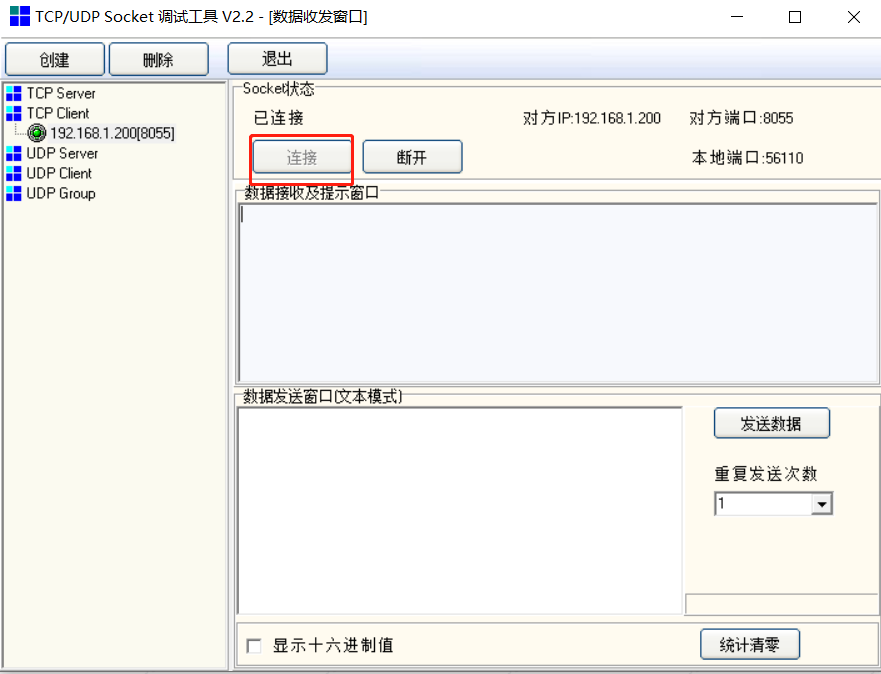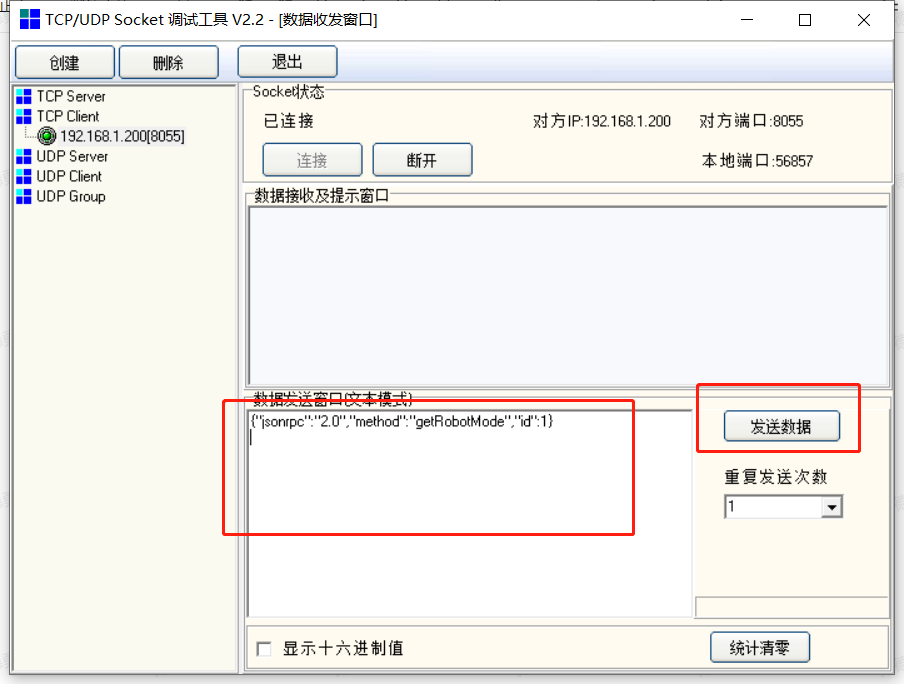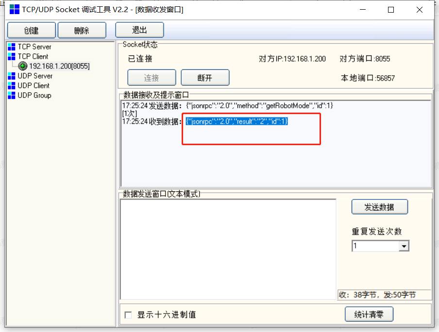 以 socket 助手為例,只需要知道機(jī)器人的 ip,端口填寫 8055。連接步驟和連接成功后顯示如下: