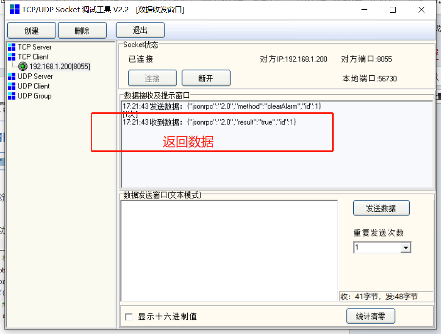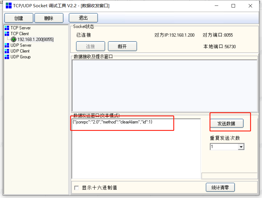 則使用socket tool發(fā)送:{"jsonrpc":"2.0","method":"clearAlarm","id":1},注意字符串最后需要換行