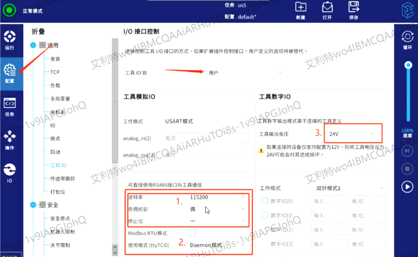 3. 安裝好后設(shè)置工具IO的參數(shù),工具輸出電壓,波特率,奇偶校驗(yàn),以及使用模式,不同品牌的力控傳感器參數(shù)設(shè)置不同,這個(gè)需要注意。如下圖:
