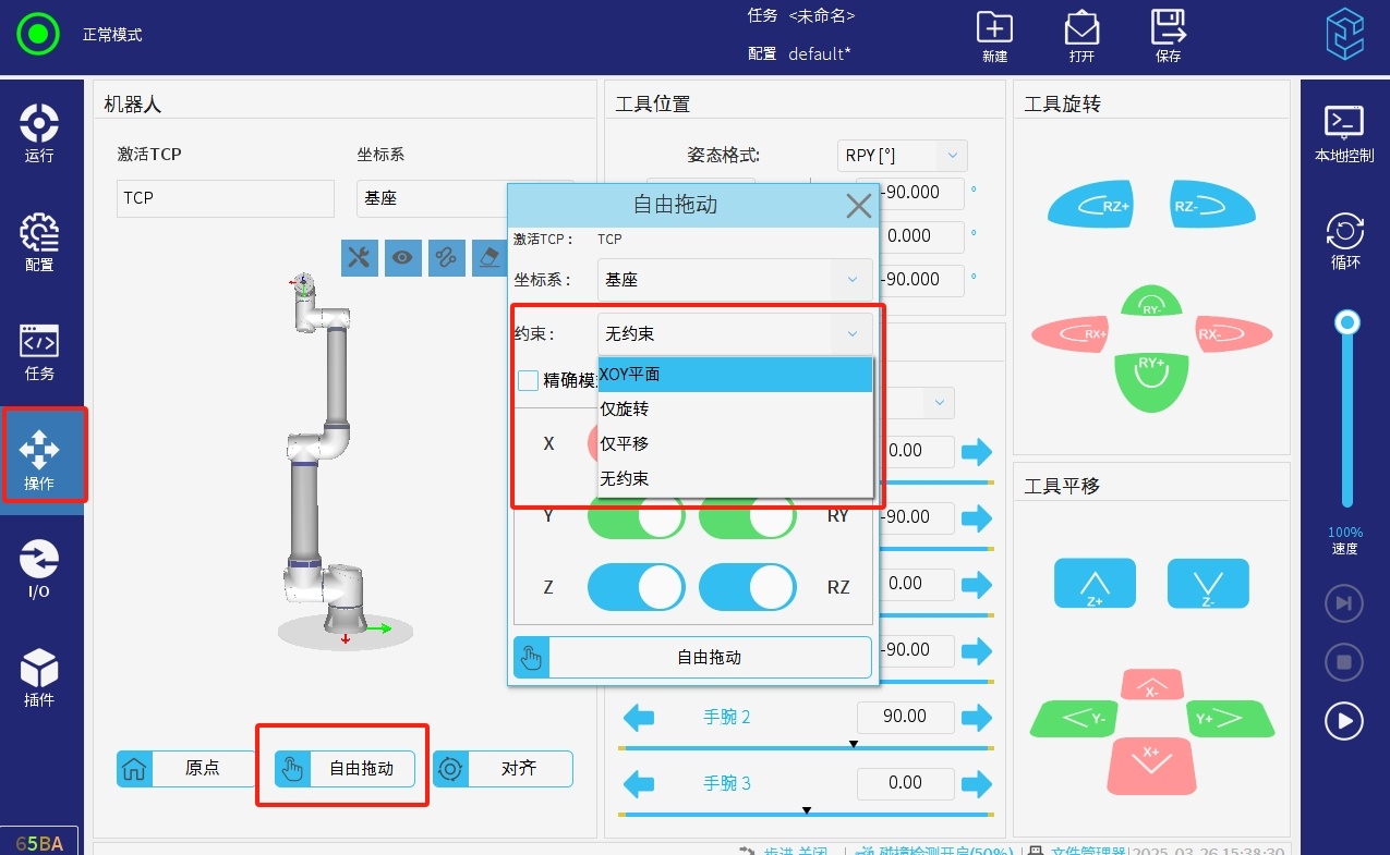 打開(kāi)拖動(dòng)界面,選擇拖動(dòng)限制,僅平面,僅旋轉(zhuǎn),無(wú)約束。