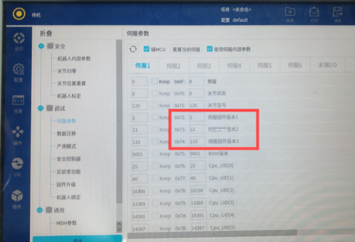 (4)下拉至”72,73,74列”,如伺服版本皆為“0”,則伺服固件異常。下圖為輔MCU正常時的版本數(shù)據(jù)。