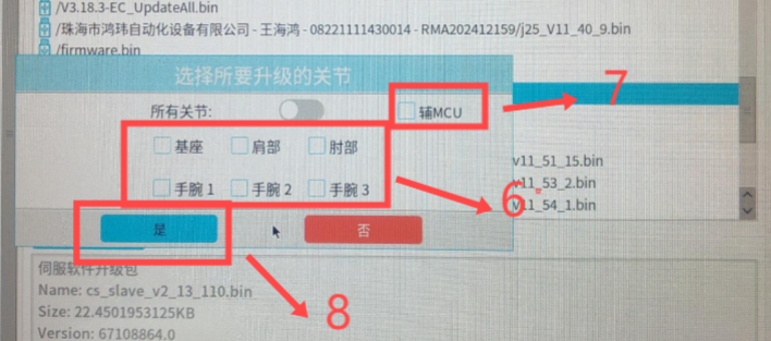 ● 點擊更新后,會彈出如下的對話框。選擇對應(yīng)”關(guān)節(jié)”,勾選輔MCU,并點擊”是“,等待升級完成即可。(主MCU升級與輔MCU操作方式一致,但不能勾選輔MCU)