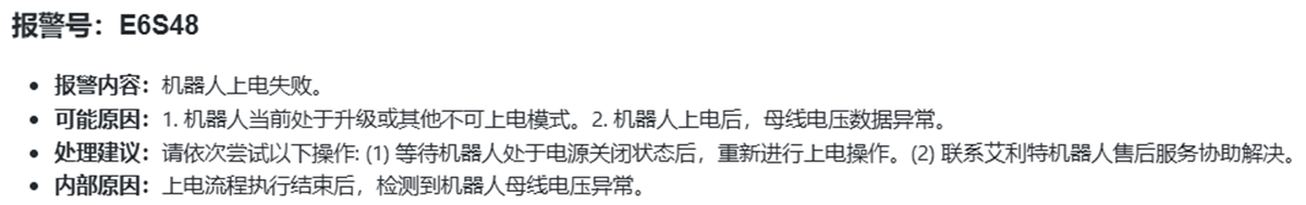 E6S48 報(bào)警所指示的是:安全系統(tǒng)報(bào)警,機(jī)器人上電失敗。其具體釋義如下: