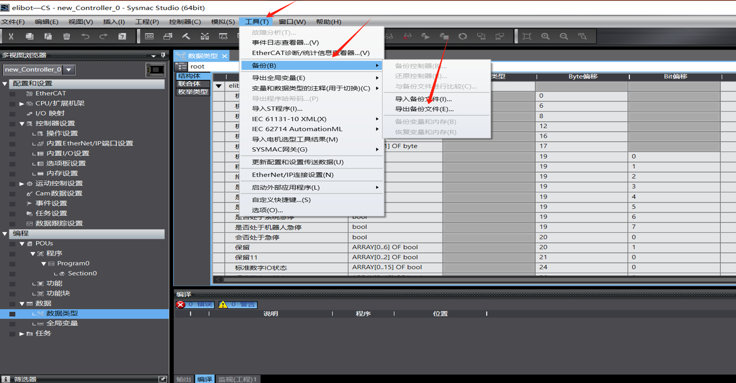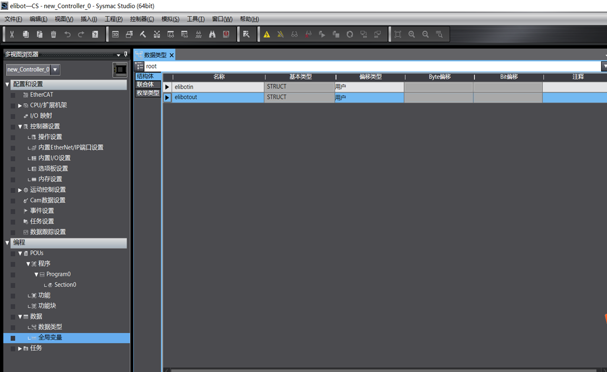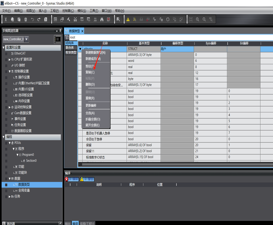 2.可以在數(shù)據(jù)類型處直接復(fù)制數(shù)據(jù)結(jié)構(gòu)體,粘貼到一個(gè)記事本里面去,需要用時(shí)ctrl+a全選復(fù)制,在Sysmac Studio-數(shù)據(jù)類型界面粘貼回去即可,注意復(fù)制出來的內(nèi)容不可以刪減,需要?jiǎng)h減,粘貼進(jìn)Sysmac Studio后在刪減,否則會(huì)出現(xiàn)粘貼不進(jìn)去的情況。