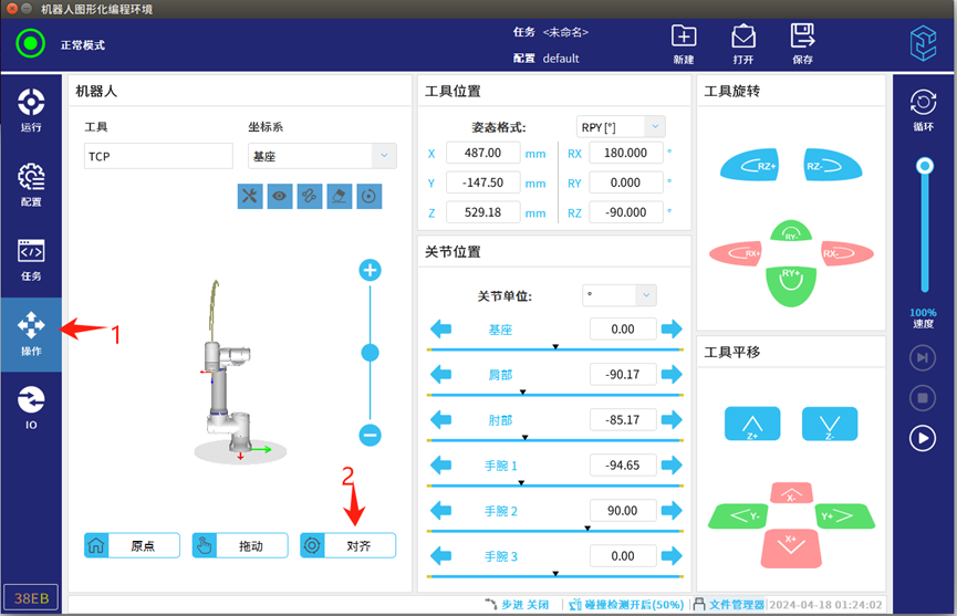 ● 自動對齊:使 TCP(工具坐標) 和當前選擇坐標系(基坐標/用戶坐標),在 XOY 平面保持平行。