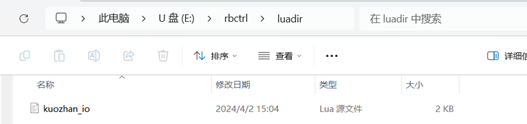 IO模塊所使用的腳本程序可查看隨同文檔一起的“kuozhan_io.lua”程序或者咨詢ELITE技術人員;準備一個U盤,在U盤根目錄下新建rbctrl文件夾,并在該文件下新建luadir文件夾,將配套的腳本(.lua格式)放到luadir文件夾下,并將U盤插至控制柜U盤口。