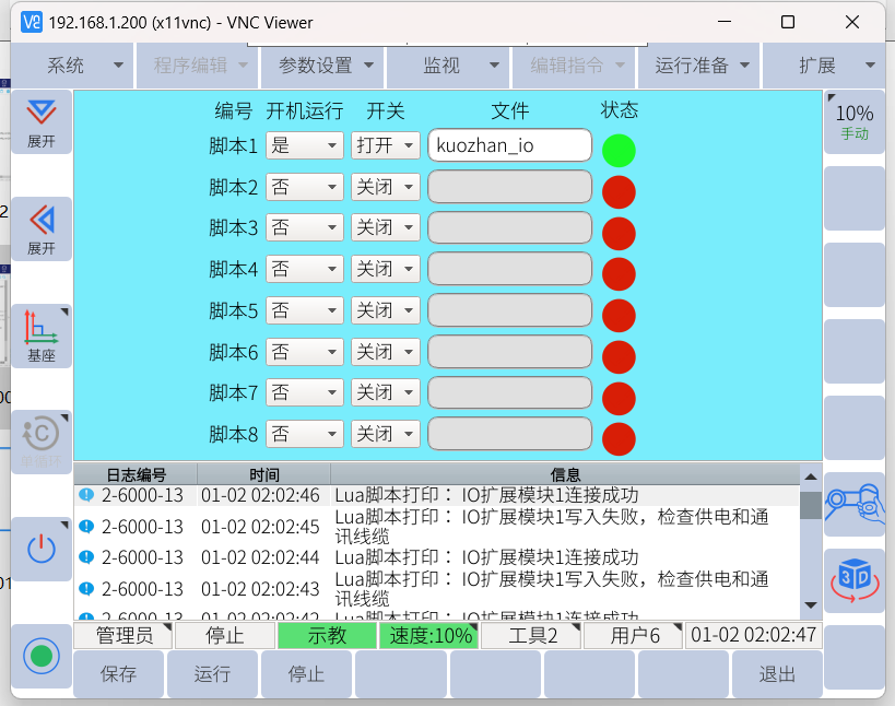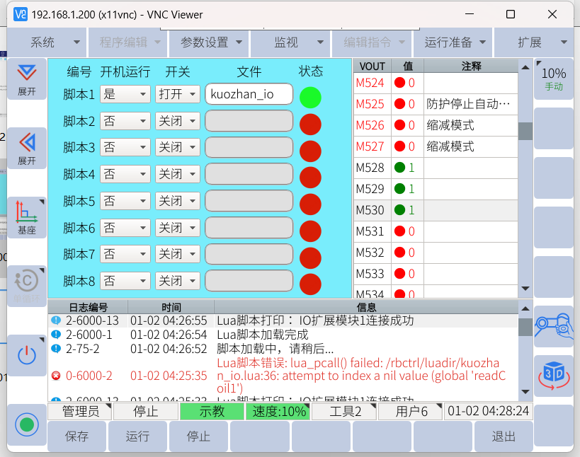 就得更改LUA腳本文件多加入一個從站的鏈接以及M變量的映射等,Kuozhan_iox2.lua是連接兩個IO模塊時所用到的腳本kuozhan_iox2.lua,如需使用多個IO模塊時可根據此腳本修改類推。