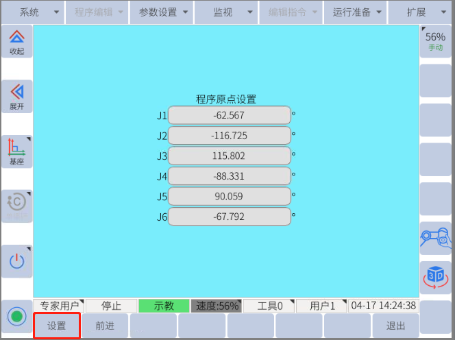 2. 將機器人移動到所需的程序起始位置。導(dǎo)航到運行準(zhǔn)備 -> 零點設(shè)置 -> 程序原點,按“設(shè)置”按鈕,將機器人當(dāng)前位置設(shè)置為程序原點