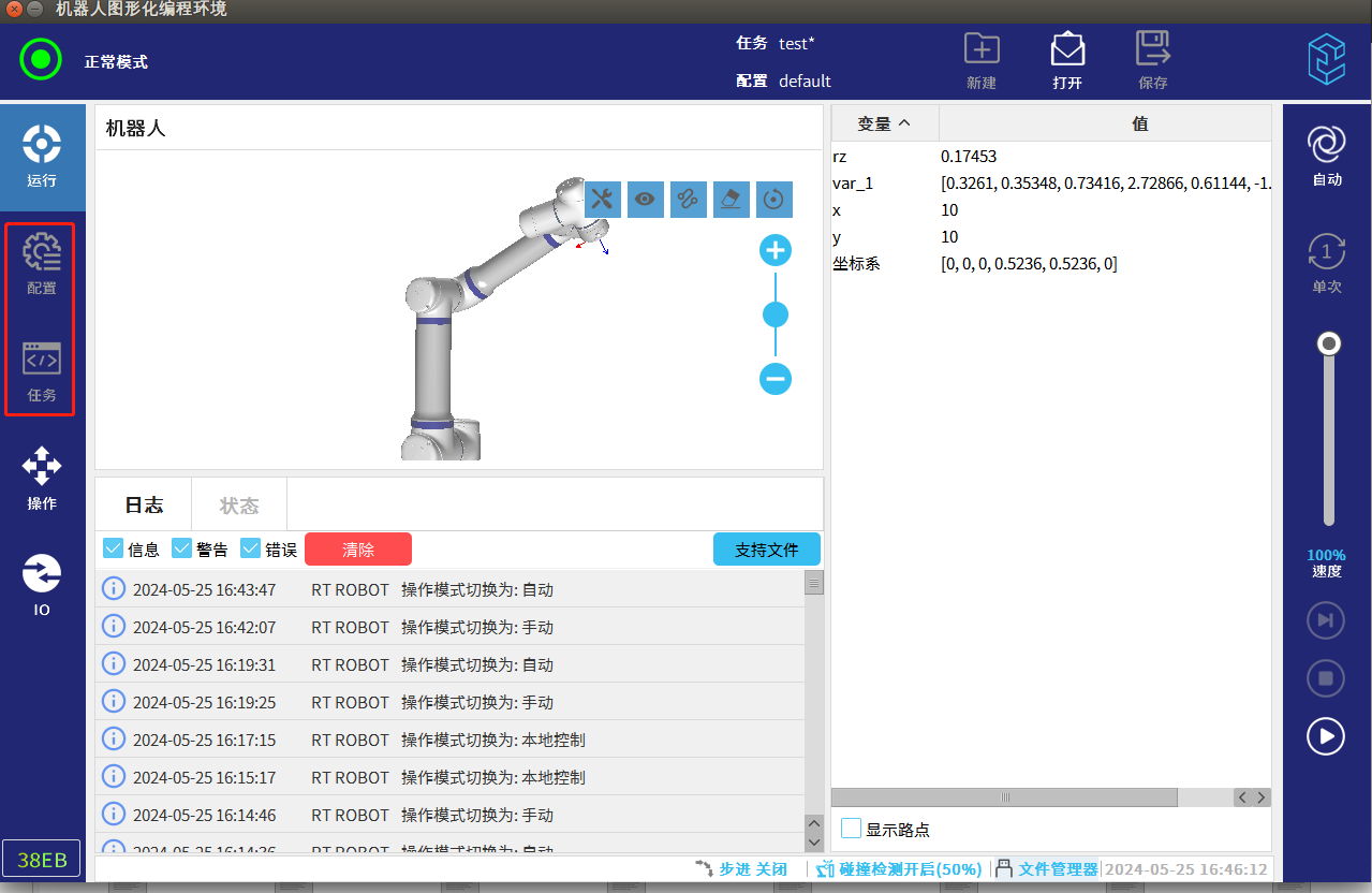 如果需要在自動模式下修改速度,則需要在設(shè)置模式的界面中選擇通用配置,勾選自動模式速度調(diào)節(jié),此時再切換成自動模式時,右邊的速度滑塊就可以進行速度調(diào)節(jié)