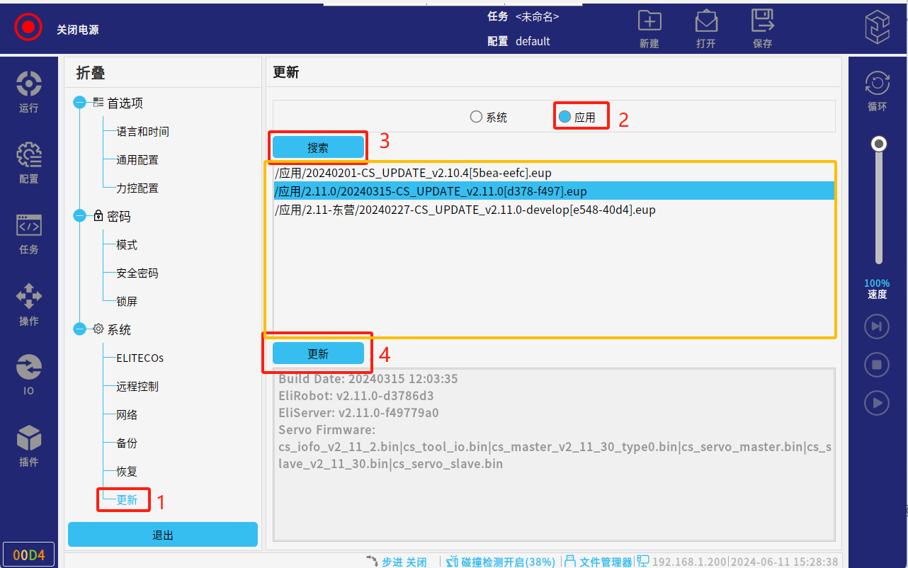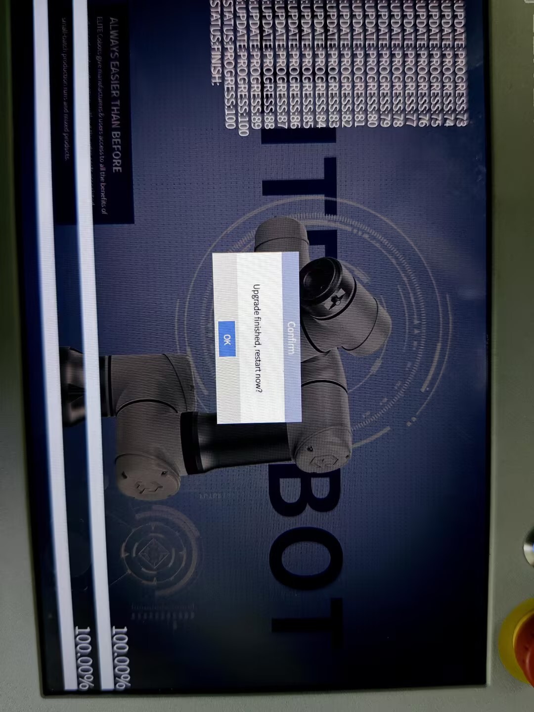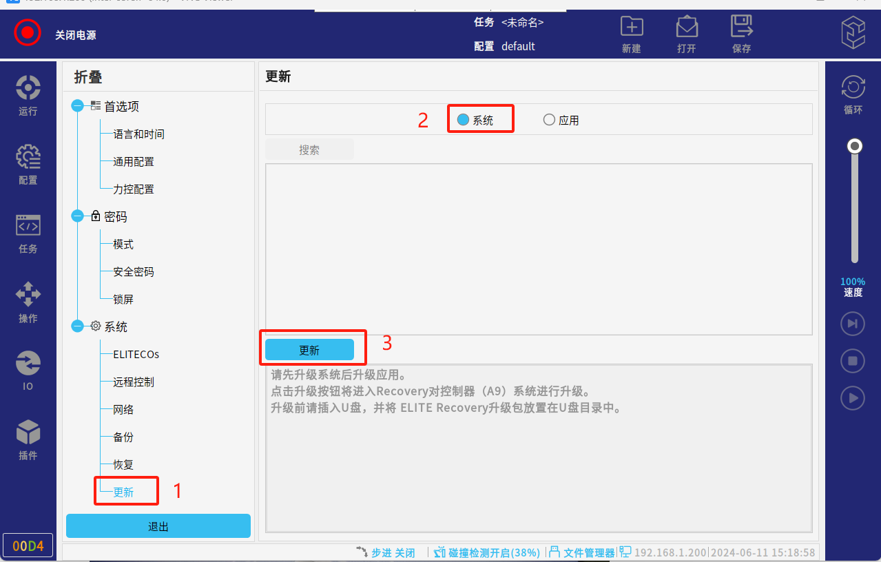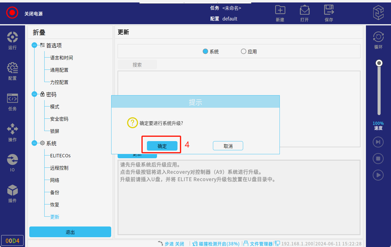 調試階段建議全部勾選進行升級,也可單獨勾選應用升級(應用:系統版本,一般是解決應用軟件的bug和界面優化;MCU: 指伺服升級;驅動IO:指末端IO的升級)。點擊“是”,會自動進行更新系統;請勿操作機器人或將其斷電。等待更新后重啟。