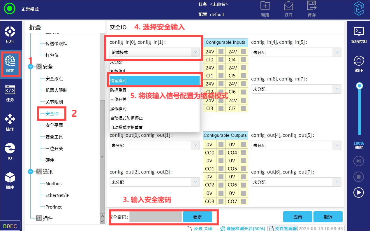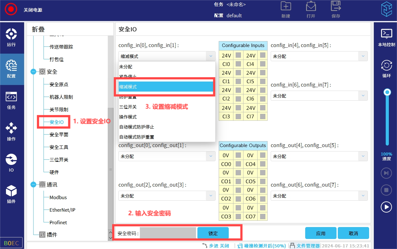 縮減模式的應用場景二是在安全IO功能配置界面的安全輸入/輸出選項中,可以選擇配置縮減模式信號,以實現不同的功能。