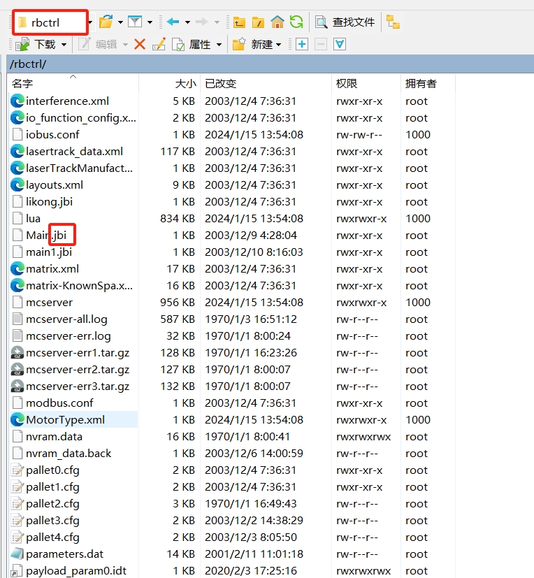 利用FTP軟件連接成功之后,在機(jī)器人文件系統(tǒng)內(nèi),按照下圖目錄找到rbctrl文件夾