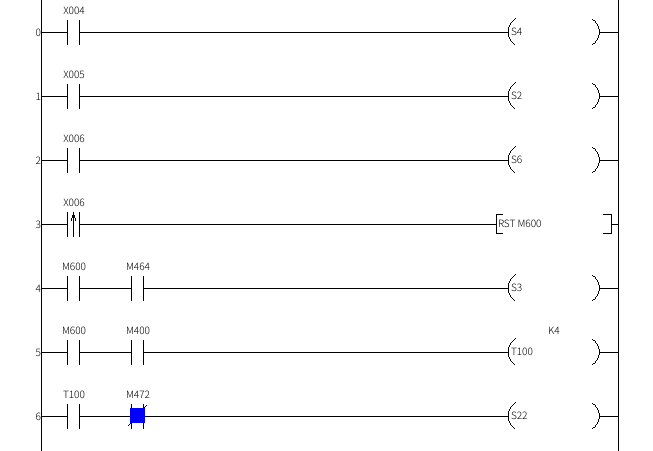 第 0 行:按下啟動按鈕(X004)為“1”M601有信號,M601關聯啟動S1。