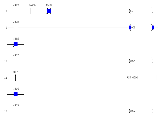 第 15 行:M602有信號,M427(運行狀態)有信號且T103計時到達復位M600。